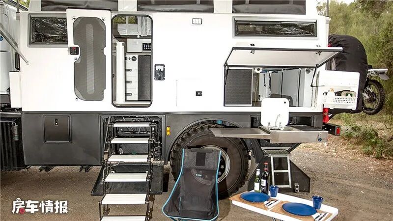 外观方面,这款房车以白色和黑色为主,虽然简单,但是也丝毫掩盖不了它强悍的外表,全车尺寸约为5965*2510*3660mm,轴距为3850mm,庞大的车身给人一种不言而喻的霸气,在户外越野穿行时,就如同森林之王一般。