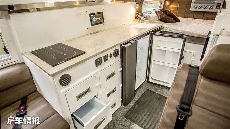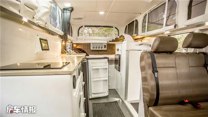 走进车内,可以看到与车外强悍硬朗完全不同的设计,生活区更有家的温馨之感,大面积采用白色面板以及咖啡色布艺装饰,简洁干净,住在里面心情更加舒畅。由前到后依次为会客区、卫生间、厨房区以及后置大床,车内的各项设备均可用触控板进行操控,现代感十足。