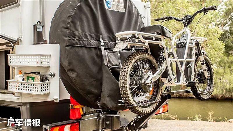 得益于庞大的车身,外侧安装了很多设备,有车头灯、左侧顶部的遮阳棚、电动踏步、外置厨房、贯通式的超大储物舱、车尾备用轮胎、自行车架、充电接口、注水接口等等设备,除此之外还有液压四点升降系统,既可以支撑车身,还可以在有需要时方便的拆卸轮胎。驻车时,车顶还可以升起,为车内提供更高的垂直空间以及整体的空间。