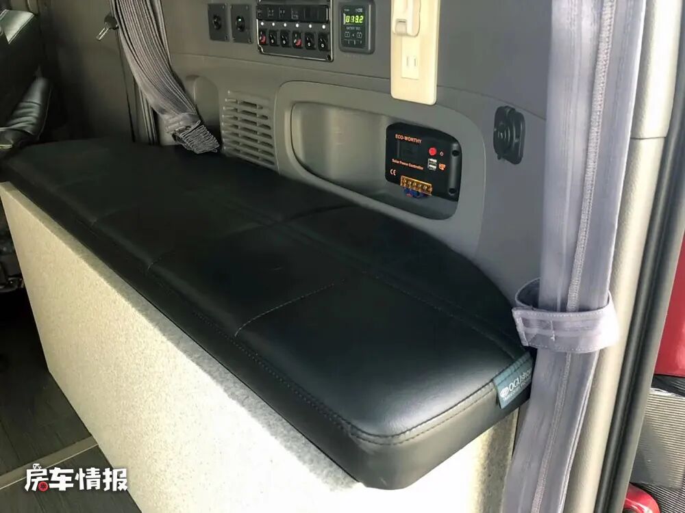 电路上,这款车搭载了基础的逆变器,提供一块副电池,并且在顶部还加装了100W的太阳能板,水路上也提供了净水箱和灰水箱。