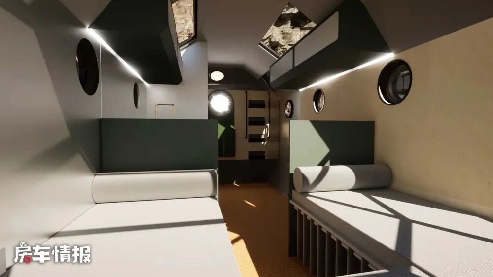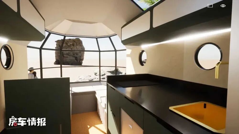 进入车厢内部可以看到,得益于后方超大尺寸的观赏窗,整辆车内部的通透性非常好,靠近观赏窗的位置其实既是整车的会客区,也是夜晚睡觉的休息区,平时是以U型沙发的布局样式呈现的,搭配上餐桌则可以满足基础的就餐小聚需求,晚上则是一左一右两张单人床,当然后期还可以拼接组合在一起变成一张尺寸较大的床铺,满足基础的休息睡觉需求。