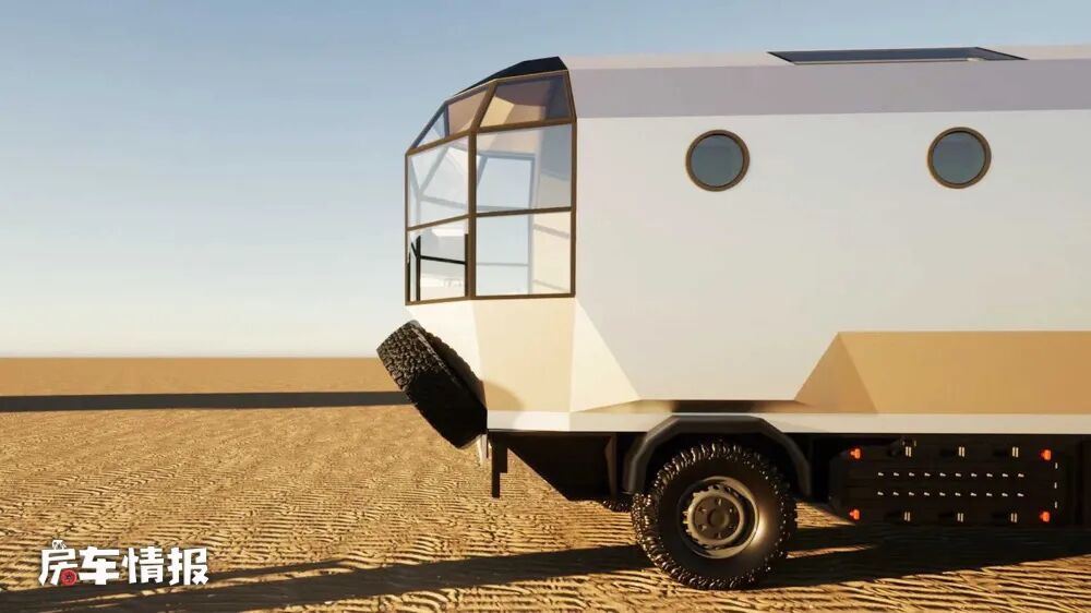 这款概念露营车是在底盘之上加入了一个类似太空舱的厢体,使整辆车看起来非常有未来的感觉,厢体采用全铝面板的材质,最尾部则是超大尺寸的全景观赏窗,不得不说这样的设计非常的吸引人眼球,不仅可以在露营的时候更亲近大自然,欣赏壮丽的美景,还可以享受太阳自然的“叫醒服务”,而挂放在观景窗下方的两个备胎,让我不得不想起了“小黄人的造型”~另外在车厢右侧也带有基础的遮阳棚,以便日后可以在车外休息。