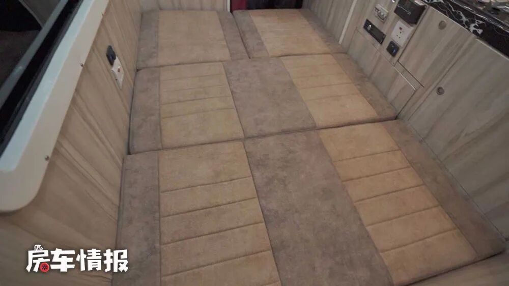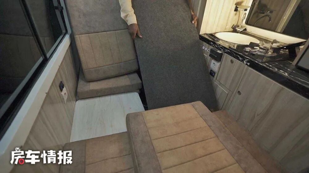 另外一侧则是车内的主要会客区,提供了长排的沙发座椅和基础的餐桌,日常也可以满足就餐或者工作的需求,最关键的是在晚上还可以变成一张尺寸较大的双人沙发床,也能为更多的人提供睡觉休息的地方。
