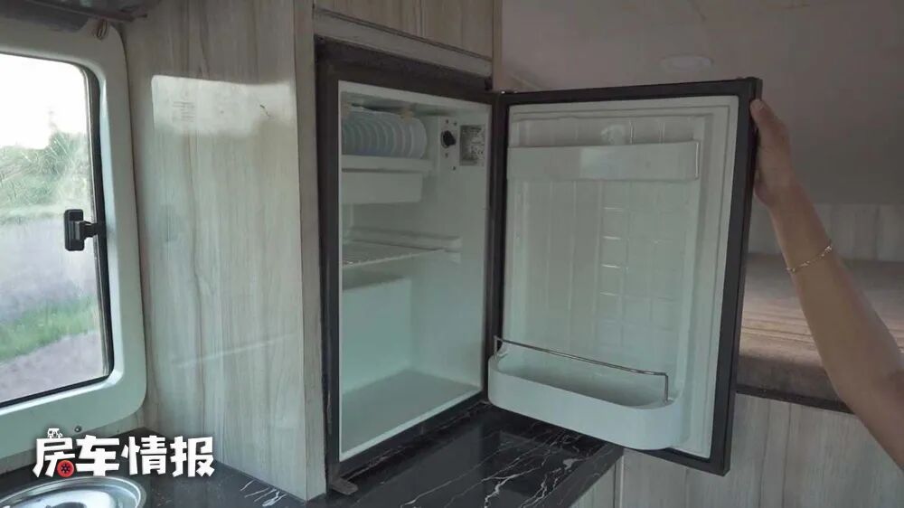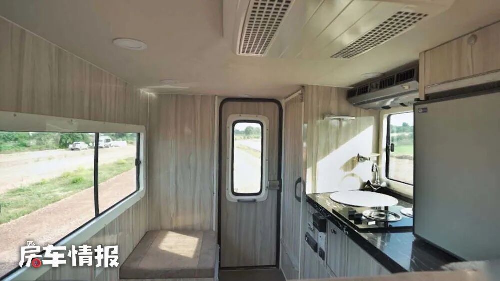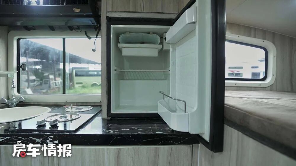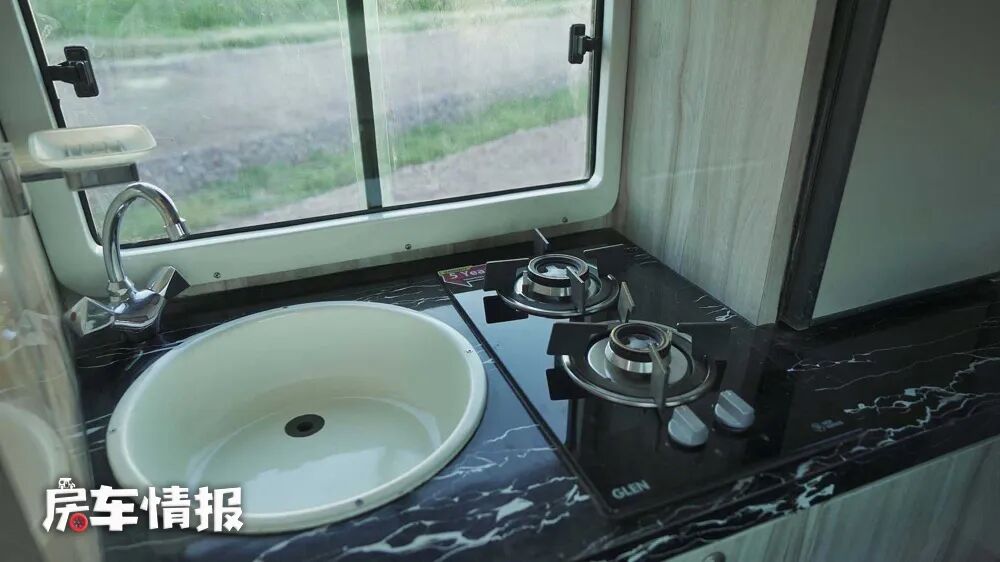 车厢中部一侧是主要的厨房区域,厨房操作台的尺寸虽然挺大的,但是因为前方车载冰箱占据了一大块地方,所以台面上只配置了基础的水槽和竖式的双孔燃气灶,并没有可以备菜的区域,不过上方还是提供了一台抽油烟机,侧面的窗户也是横向推拉式的,对于日常的使用更加的便利。