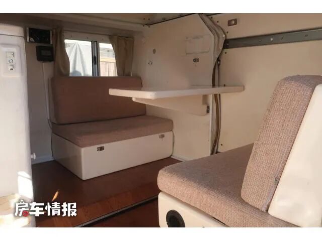车厢内部设计的算是非常的简单了,因为车身尺寸的限制,所以后车厢更像是一个正方形,里面带有一个基础的对卡座区域,侧面还提供了一张小型的折叠餐桌,驻车之后也可以满足四个人的就餐小聚需求。