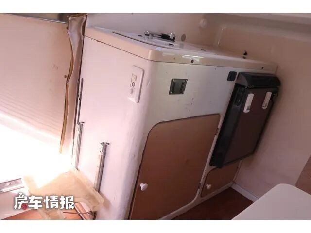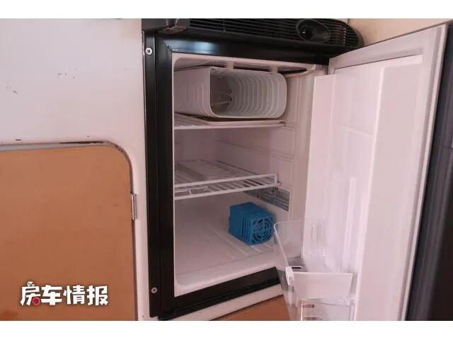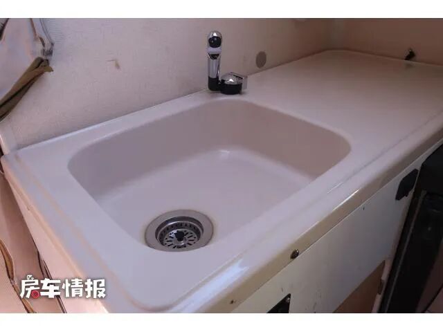正对乘客门的是一个小型的厨房操作台,台面上带有基础的翻盖水槽,下方则提供了一些小型的储物柜和一台小型的车载冰箱,也能满足最基础的生活需求。