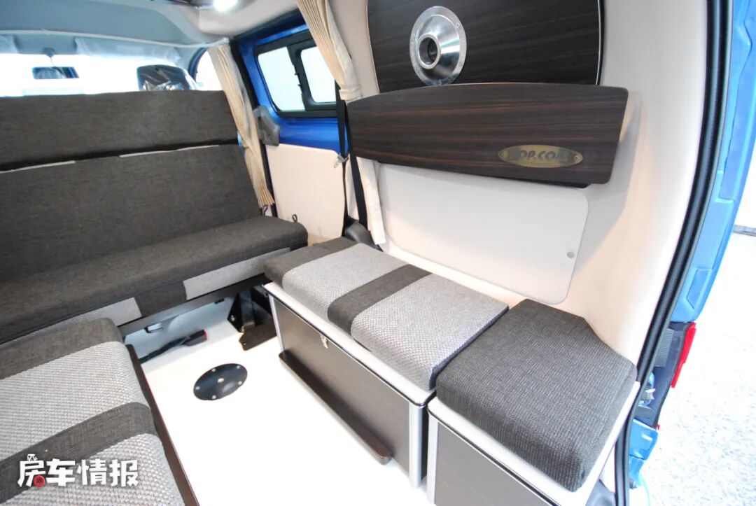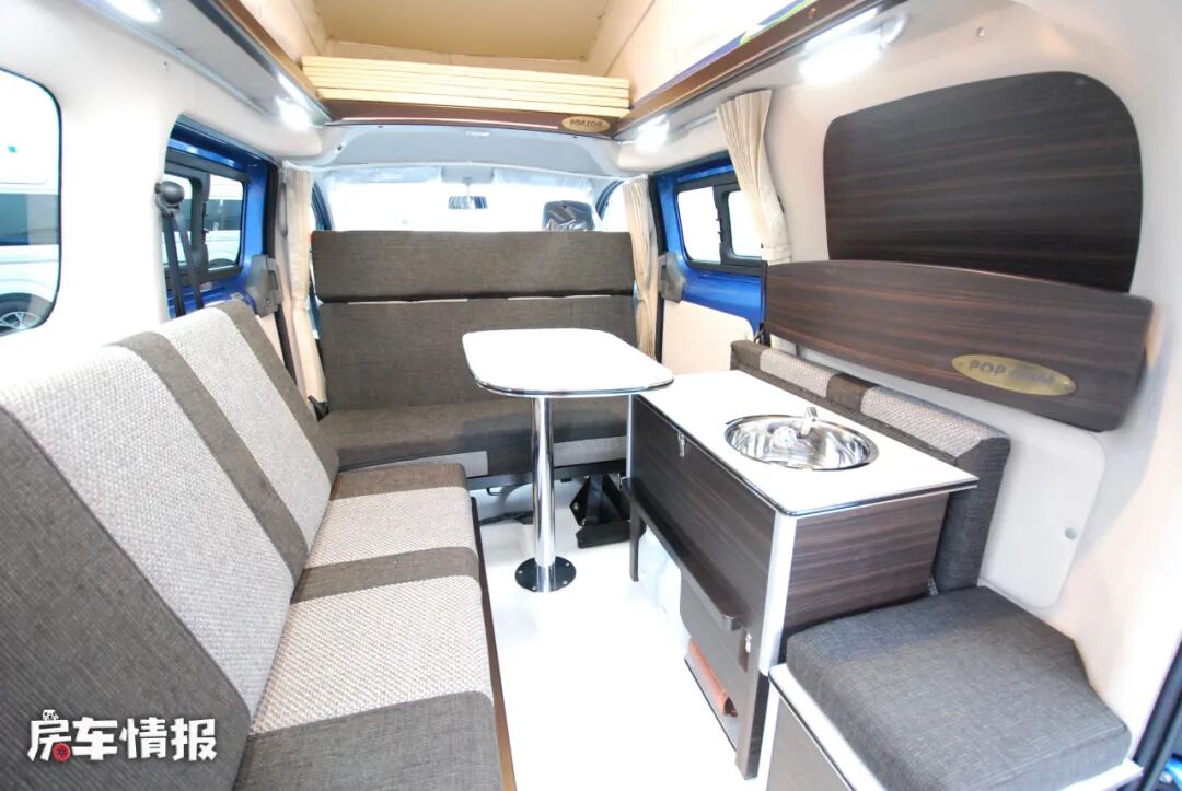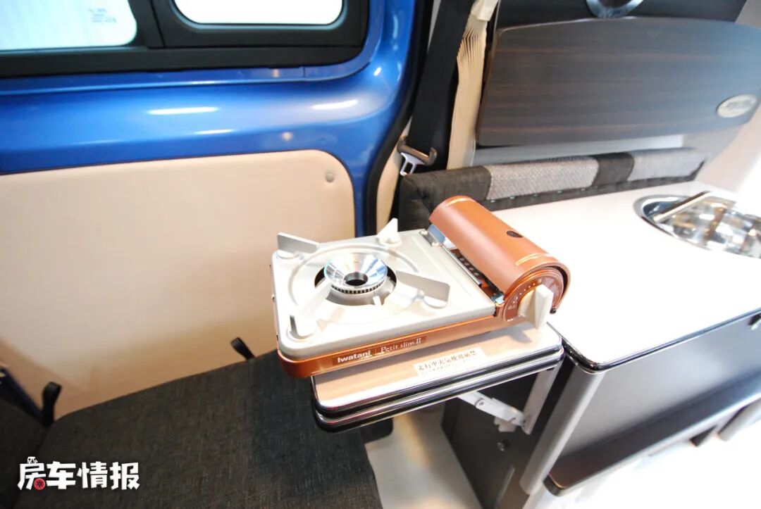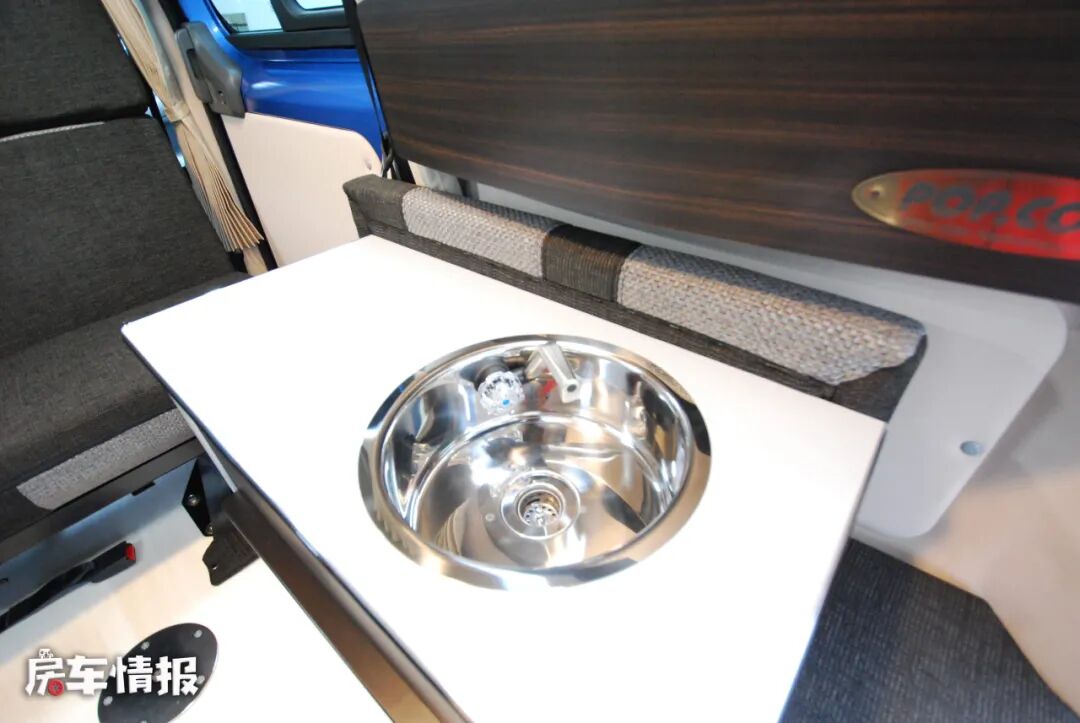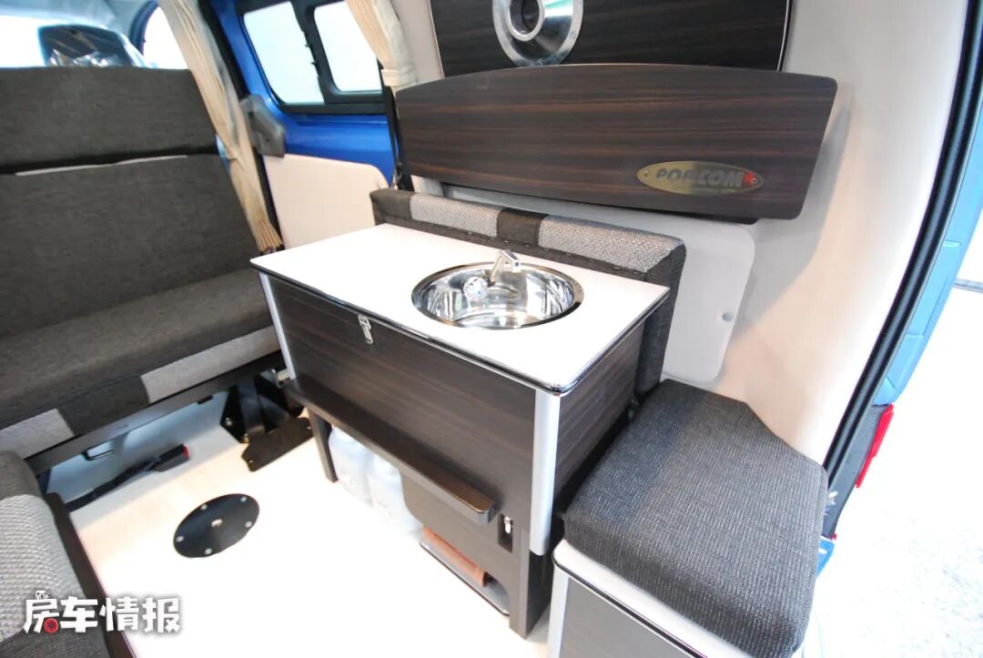 车厢尾部还提供了一长排双人座椅,不过是纵向式的摆放角度,另一侧则是一个小型的厨房操作台,台面上带有基础的不锈钢水槽,侧面还有可拓展的小桌板,匹配上车内自带的便携式卡式炉,也可以满足日常基础的烹饪需求。