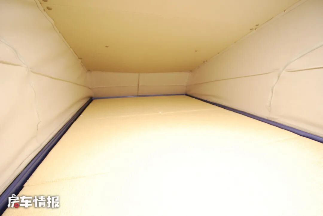 而位于升顶内的床铺,平时为折起状态,这样白天驻车后打开升顶不会占用头部空间,反而可以使车内的人正常的站直行动,到了晚上睡觉的时候,再把床垫展开,就变成了一张简易的双人床,整辆车最多可以满足4个人的睡眠需求。