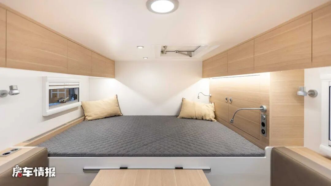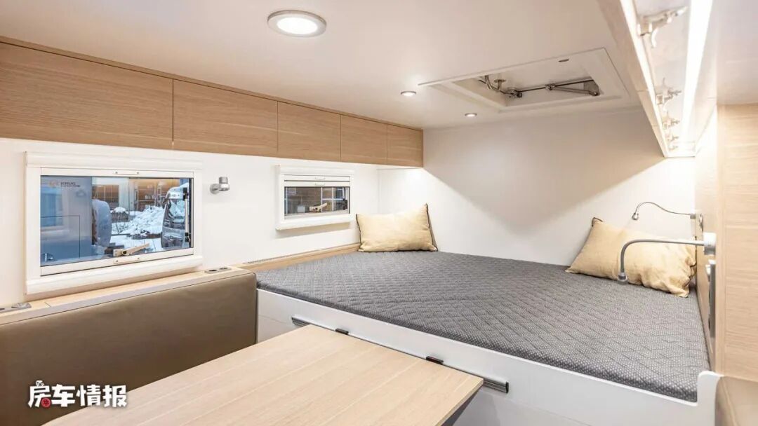最后方则是一张固定式的床铺,最多能够容纳三个人睡觉休息,另外两侧也有小型的外推窗以保证这个区域的通风和采光。