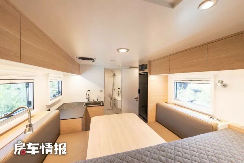 车厢内部和霸气的外观相比,更贴近温馨清新的感觉,采用了大面积米色的家具配色使整体内部感觉特别的透亮,除了可以从侧边的乘客门进入车内,前方的驾驶室与后方的生活区也是相互连通的,有一个小型的开门。
