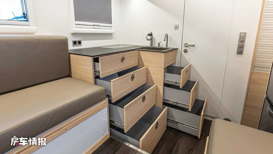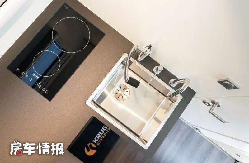 车厢中部则是整辆车的厨房区域,内侧是一个L型的厨房操作台,带有大尺寸的不锈钢水槽和电磁炉,下方还配置了很多的储物抽屉,足以存放日常的烹饪工具,而外侧靠近乘客门的地方则是一台140L的双开门冰箱,可以用来存放日常的食材。
