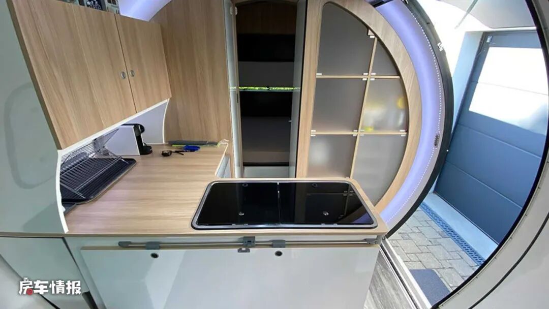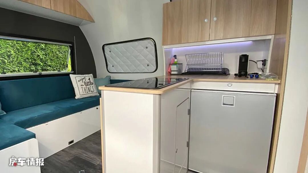 台面下方还配置了一台小型的单开门车载冰箱,顶部也提供了基础的吊柜,以方便存放一些烹饪所需的工具。