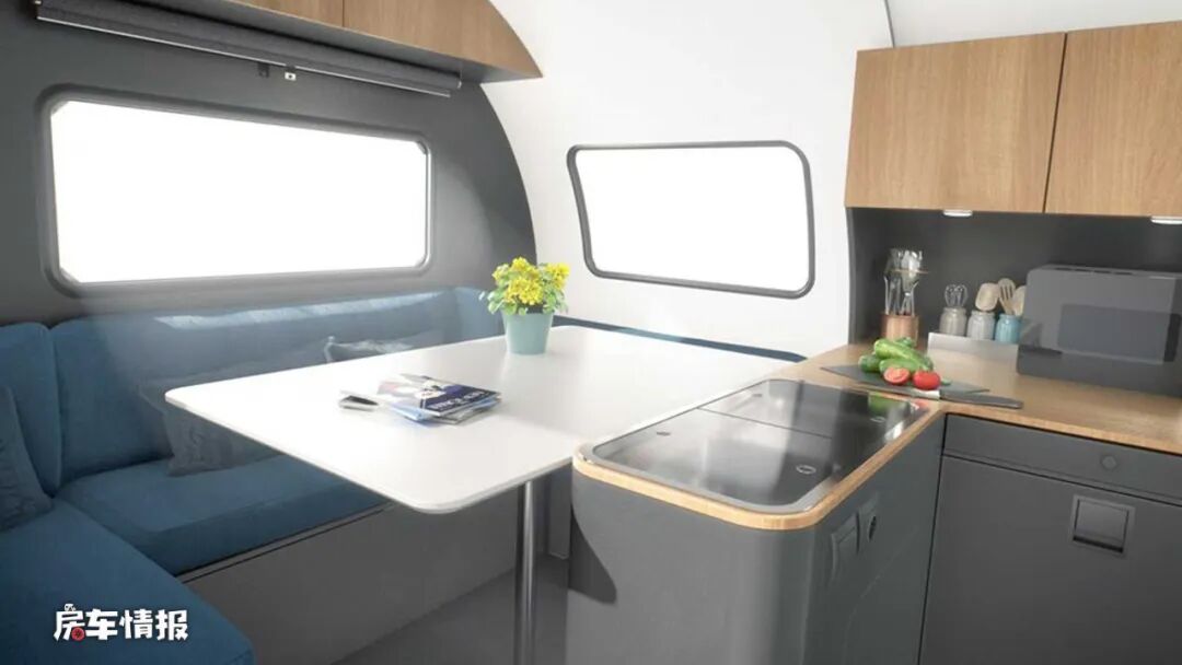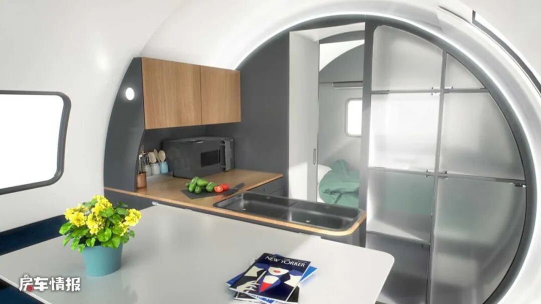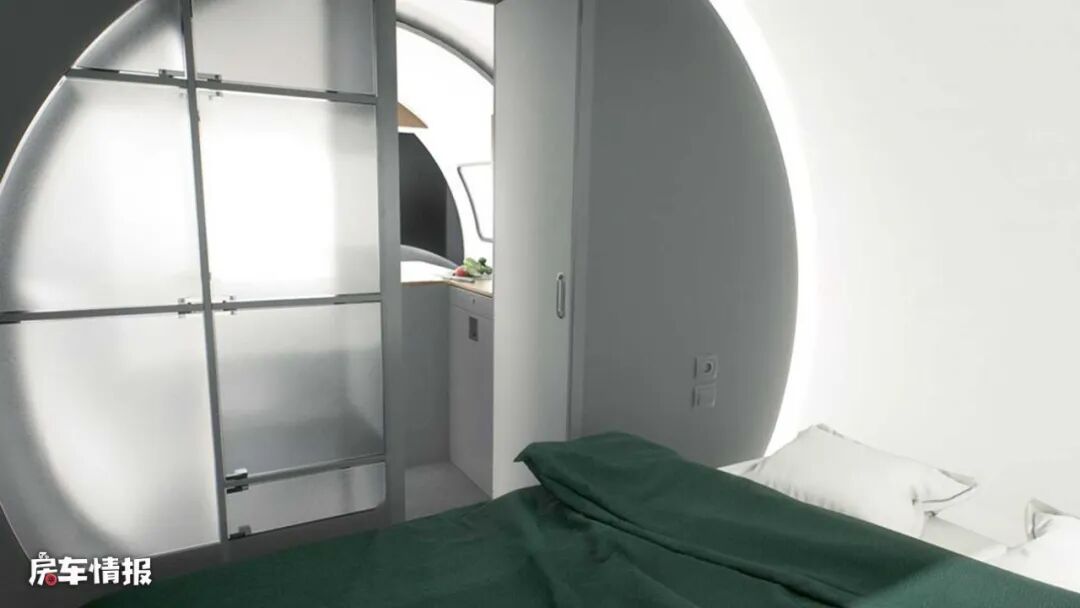整个车厢都是可电动伸缩的,有点儿像望远镜的设计,一节一节的,这样在行驶过程中把车厢收缩到最小,就不会因为宽大的身躯而影响正常的上路,驻车时再将其拓展开到最大程度,则可以得到一个相对比较宽敞的内部空间,两侧底部也有类似驻车支腿的设计,以保证整个厢体的平衡和稳固。