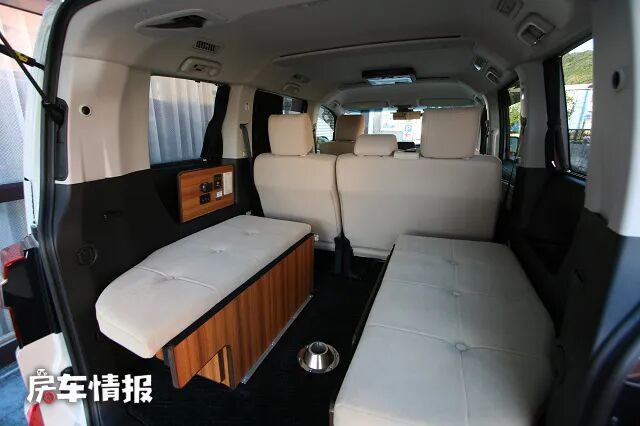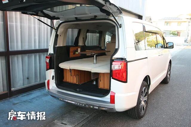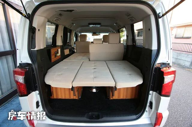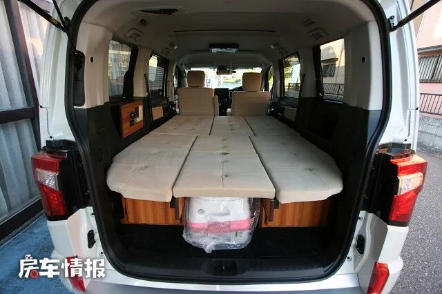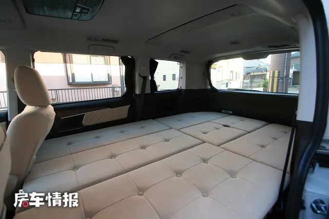 为了方便夜晚居住,整辆车也是融入了床车的睡卧功能,当晚上来临时,后方的两个柜体结合能升降的餐桌可以变为床铺的一部分,这时则需要将前排的三人乘客座椅向前放倒,以变成一张完整且平整的床铺,也可以容纳两个人的基础睡眠需求。