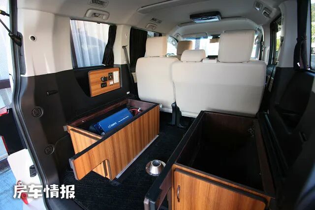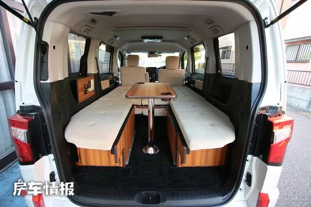 车厢尾部去除了原本的双人座椅,加入了一左一右两个柜体的设计,并铺装了软垫,中间则预留了可以安装餐桌的卡槽,驻车之后将餐桌装好,则可以围坐在这里进行简单的就餐和小憩等需求。
