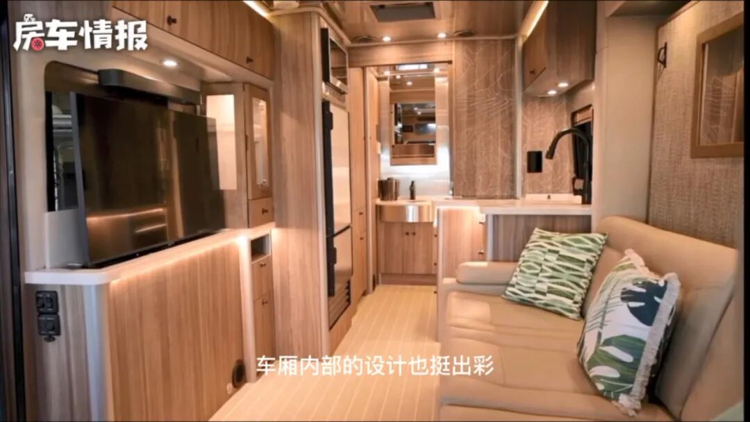 车厢内部的设计也挺出彩,由于车身尺寸比较大,内部狭长的空间令人十分舒服,左侧拓展打开后可以增大客厅空间,三人沙发后方的墙壁上隐藏着一张独立双人床,我只想说这样的设计国产房车上也有!接下来再去看看其它部分吧!哦对了,这款车起售价约为170万人民币,名副其实的豪车!