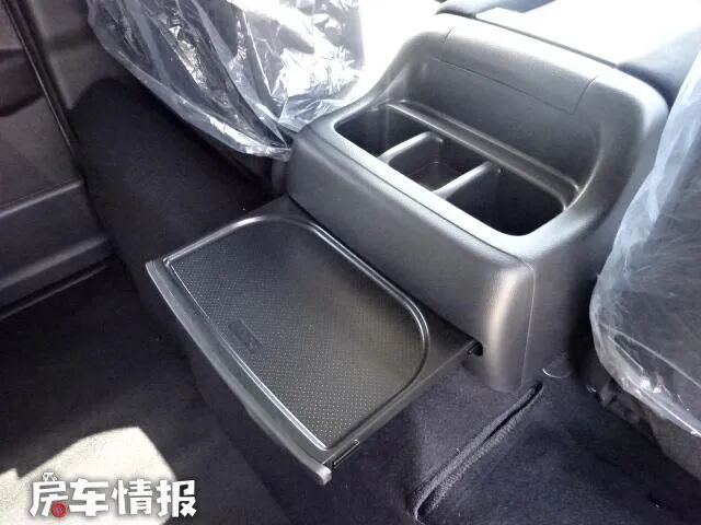 前方中央扶手后方还提供了一个抽拉式的小餐盘,上方提供了杯托,也能放置一些零食和饮料,方便日常行车的时候拿取。