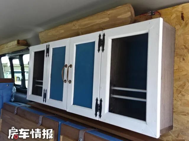 顶部则设计了一个类似家中橱柜的设计,采用了对开门的打开方式,也方便后期拿取物品,两侧则是采用了透明玻璃类似酒柜的设计,可以存放一些日常的饮料或者零食。