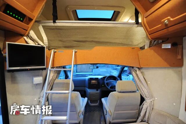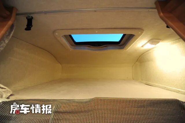 而在最前方驾驶室的顶部,还有一张尺寸为1840*1200mm的双人额头床,带有天窗,日常也能满足两个人的睡眠需求。