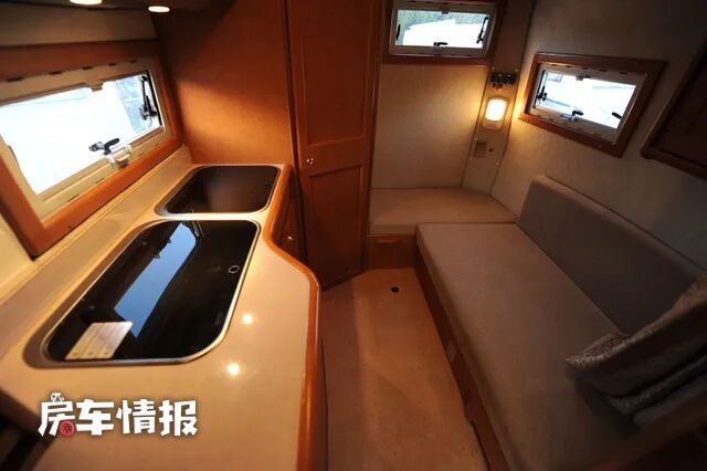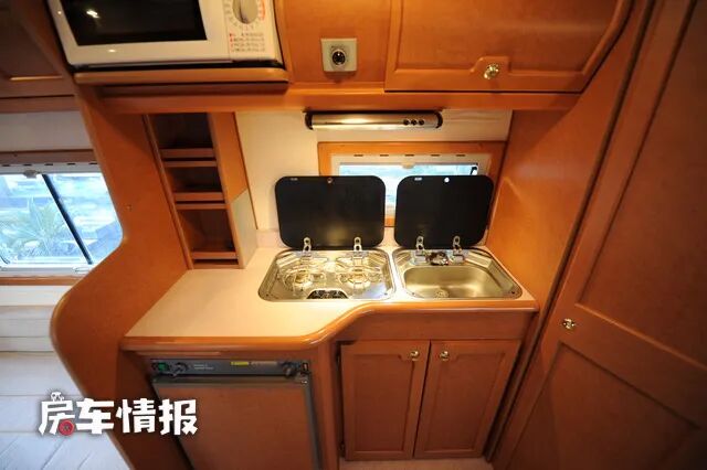 全车的厨卫区和休息区是被单独放置在车厢尾部的,带有一张尺寸较大的厨房操作台,提供了双孔燃气灶、不锈钢水槽、微波炉、抽油烟机和车载冰箱,可以满足日常的烹饪需求。