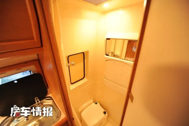 后方的独立卫浴室内部是配置了一台便携式的马桶、固定的淋浴花洒、可翻折的洗手台盆以及梳妆镜,相较于日本的传统房车,配备还是非常齐全的,足以满足日常的洗漱需求。