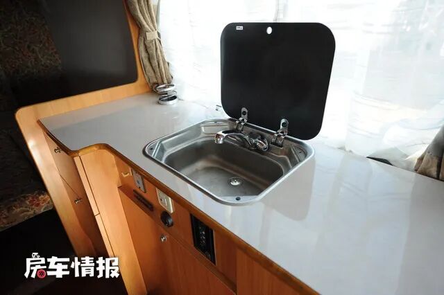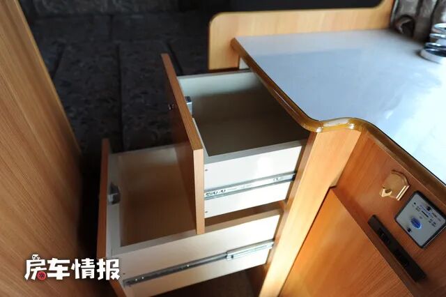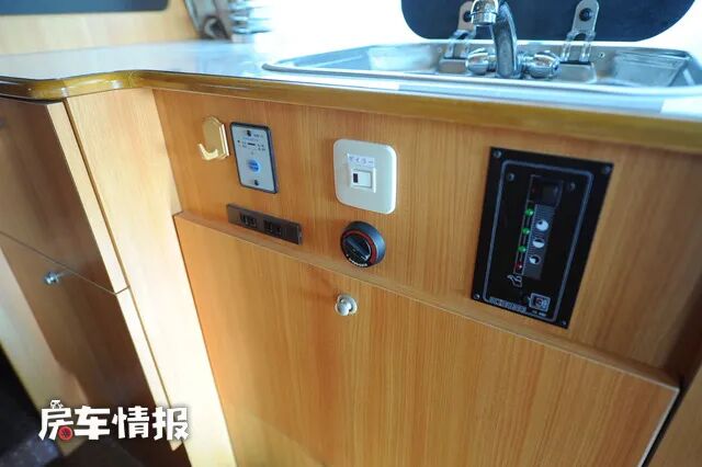 整车的厨房区还是位于乘客门的后方,提供了一张尺寸比较大的操作台,台面上带有基础的水槽和备菜区域,因为提供了充电插口,后期也可以搭配其他的厨用小电器,随车还带有一台卡式炉,所以基础的烹饪需求还是可以解决的。