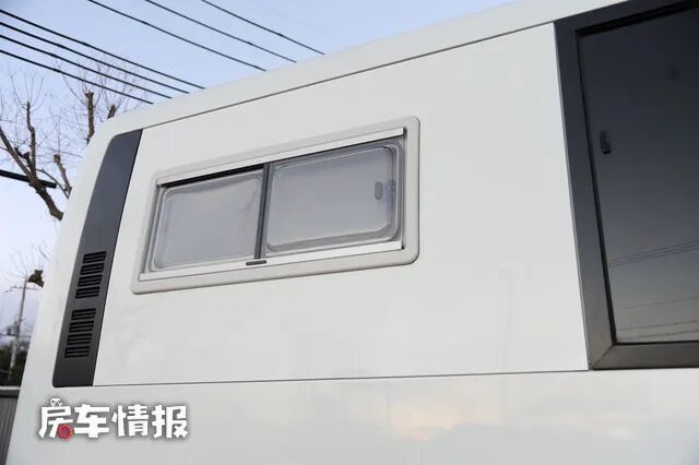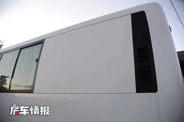 整辆车的外观还是非常简约低调的,全奶白色的车身平时不在意的话就觉得是一辆普通的中巴车,但是不同的是,为了保证车内人员的隐私性,整辆车最后两块窗户是被设计成了盲窗的样式,其中车身右侧的尾部还带有小型的推拉窗,这样即便在行车过程中也可以开启。