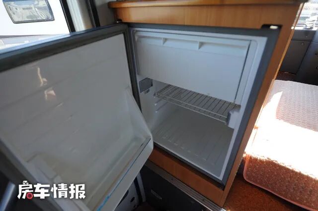 乘客门的前方依然是一个小型的电视柜,不同的是侧面是嵌入了一台车载冰箱,上面的平台则可以放置一台电视,好满足日常坐在会客区观看电视节目的需求。