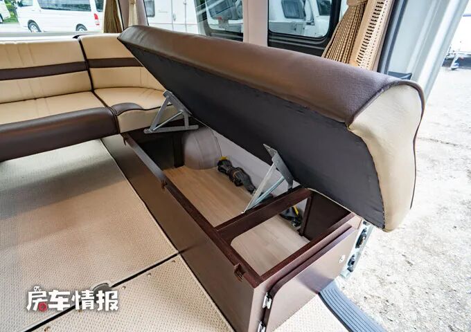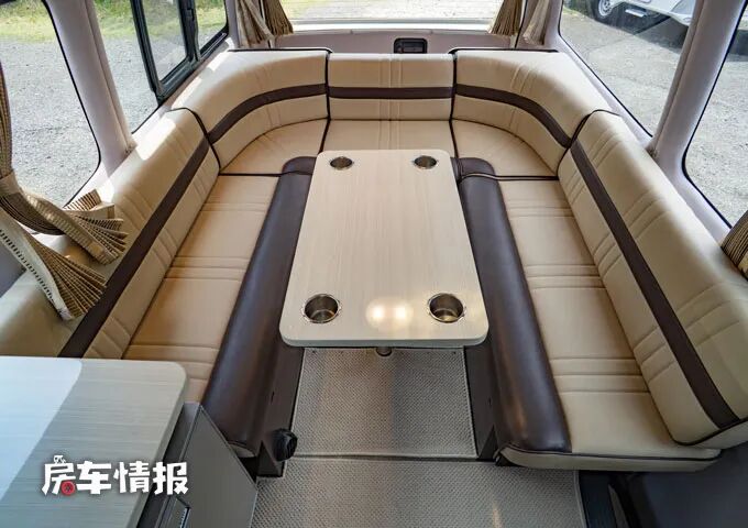 车厢尾部则是我们刚才所提到的,以U型沙发+餐桌布局的会客就餐区域,而且座椅全部采用了皮质软包的工艺,填充的也比较厚实,可以带来不错的乘坐感受,而两侧的沙发下方都是储物空间,存放一些工具或者大件的行李也是没有问题的。