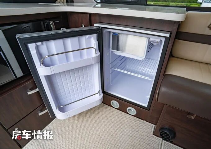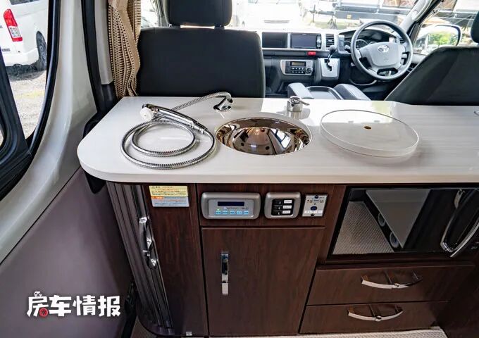 和其他我们常见的海狮床车不太一样,这款车内并没有保留原来的乘客座椅,在主副驾驶座椅后方是设计了一个超大型的L型厨房操作台,台面上方带有基础的不锈钢水槽,旁边则可以放置卡式炉和备菜,下方则嵌入了一台微波炉和一台49L的车载冰箱,以满足日常的需求。