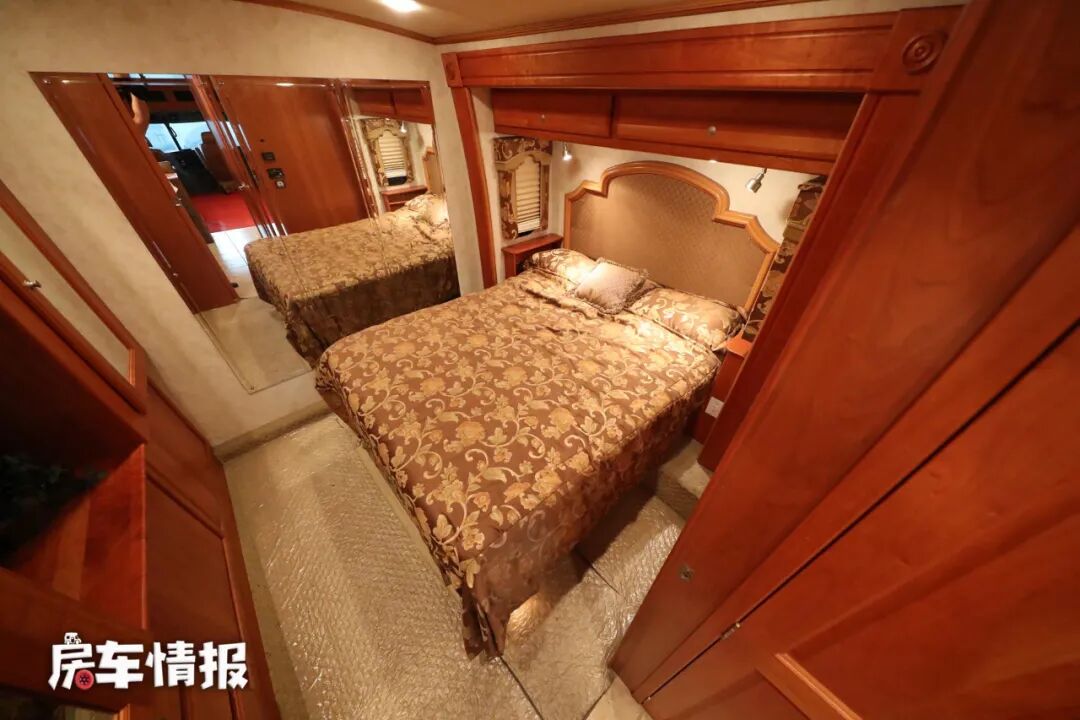 车厢尾部就是车内的主休息区,一个堪比家里主卧室的空间,内部提供了一张尺寸超大的双人床,尺寸以及舒适度基本上和家里的床一样,另外得益整车较高的车身,站在这个“卧室里”,完全不会觉得憋屈。
