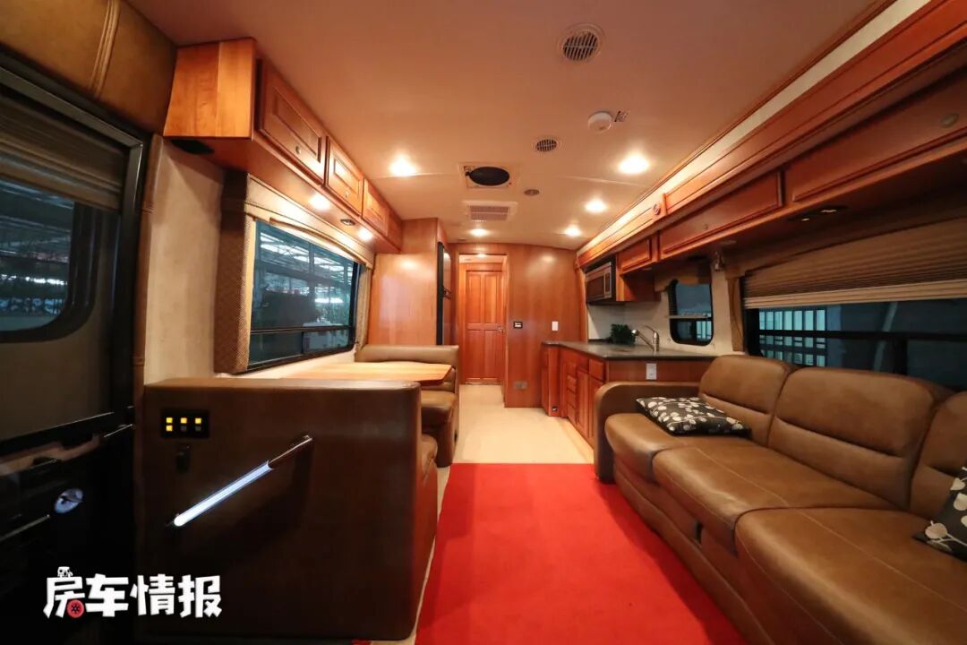 进入车厢内部,可以看到内部呈现出一个狭长的空间,实木色的家具配色,看起来颇有美式豪华风,和国内那些靠彩色氛围灯装饰起来的“土豪”风格,形成鲜明对比,稳稳地居家中带着豪华。