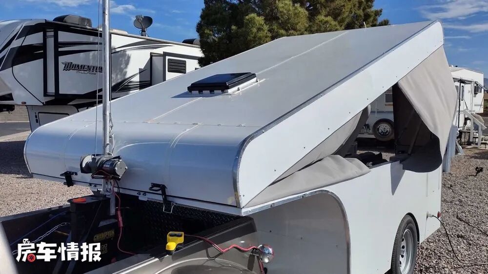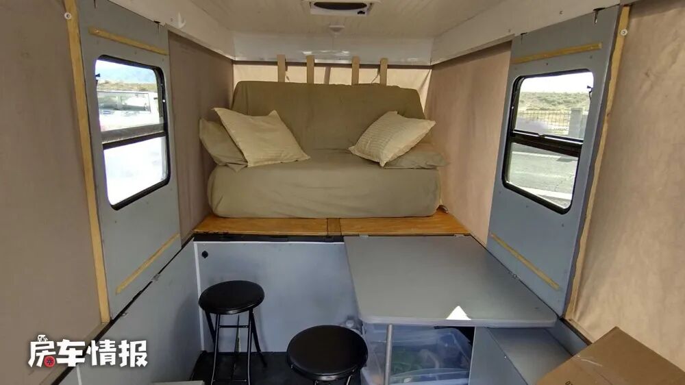 车厢中部则配置了一张比较简易的餐桌和两把便携式折叠椅,这样一些日常的就餐需求也能够解决,虽然说这升顶采用的是软质的设计,但是在中部两边则是采用了小一块的硬质材质,还配有大尺寸的外推窗,这样即使不需要周围的升顶支架,就可以使整个顶部很稳定的保持平衡。