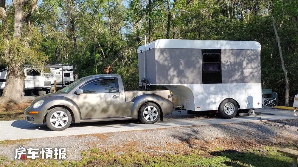 根绝甲壳虫的牵引力,后方的拖挂车总重量保持在1500磅(约合680kg)以下,为了拥有和前车一样的高度,后车看似就像是一个拉货的大箱子,不过和普通拖挂房车不一样的是,这个厢体的顶部带有直立升顶的设计,所以驻车打开升顶之后,也能够满足正常的站立和生活。