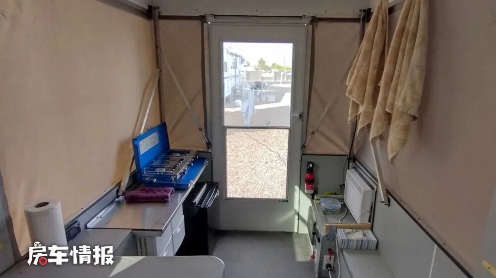 进入后车厢需要从车尾进入,因为有限的空间,所以内部设计的比较简单,也没有什么华丽的装饰,尾门的一侧是一个较宽的操作台,带有车载冰箱和储物空间,另一侧则是嵌入了一台微波炉,并配有外接电源,也就是后期还可以使用电磁炉、电饭煲一些小功率的厨用电器,用来满足更多的生活需求。