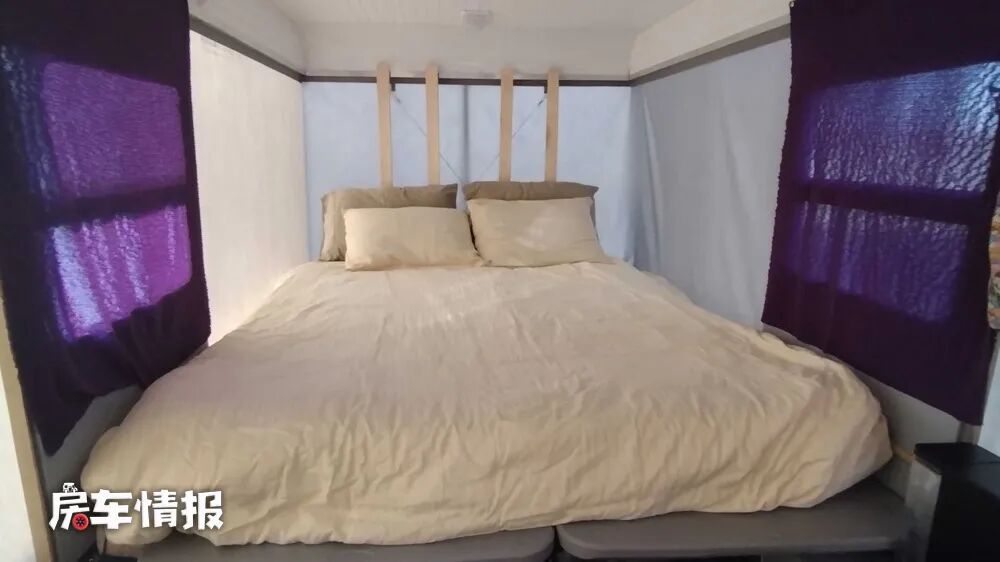 升起顶部之后,最前方就出现了一个类似额头区域的地方,这也是整辆车唯一的休息区,带有一张可以折叠的沙发床,展开之后就变成一张能够容纳两个人使用的双人大床,不过由于整个车厢上半部都采用的是软性材质,所以车内的保温程度的确令人堪忧。