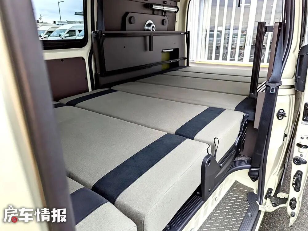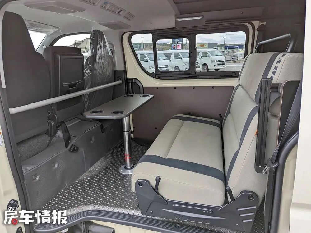 车厢内部保留了第二排双人乘客座椅,并带有安全带,结合采用了一主两副设计的驾驶座,整辆车在行车过程中最多可以乘坐5个人,座椅前方带有一张可拆卸的小型餐桌,也能够解决日常基础的就餐需求,另外还可以用来简单的办公。