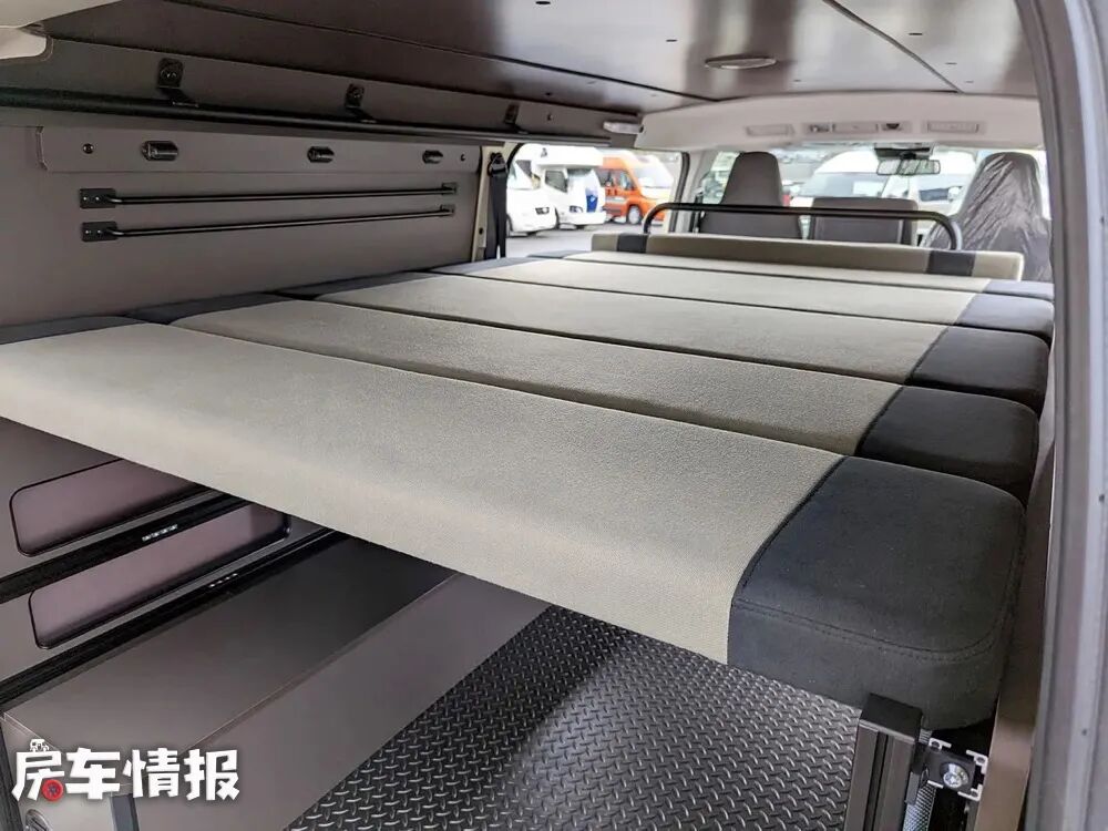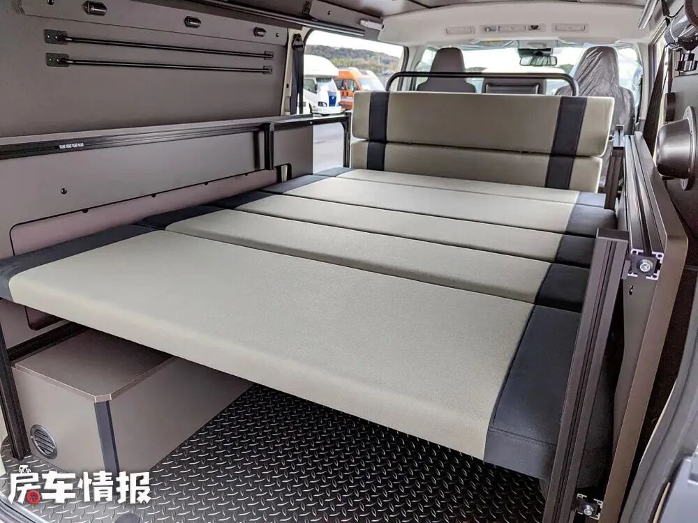 打开上掀式的后尾门,可以看到车厢后方空置的空间,日常也可作为储物空间使用,两侧则带有JAOS的滑轨,上下方分别放置了床板,当晚上睡觉的时候,将上方的床板移动到下方,与下方的床板和前方可放倒的乘客座椅相互拼接,则可以组成一张前后贯通的大尺寸双人沙发床。