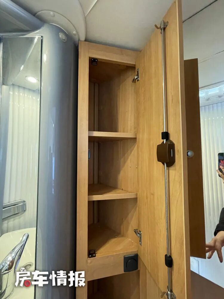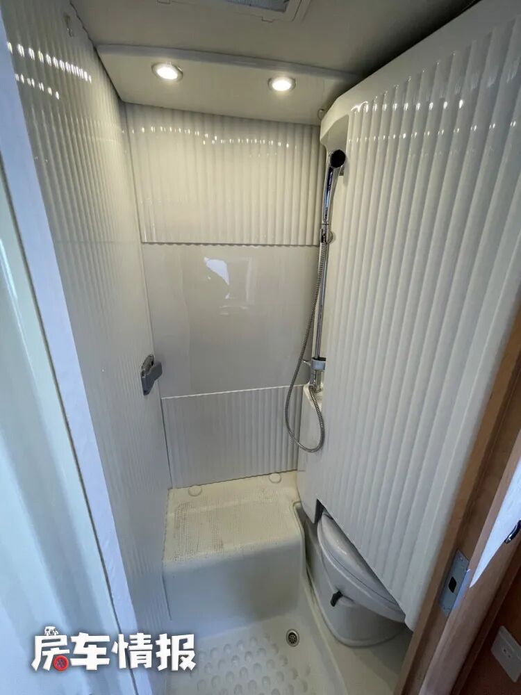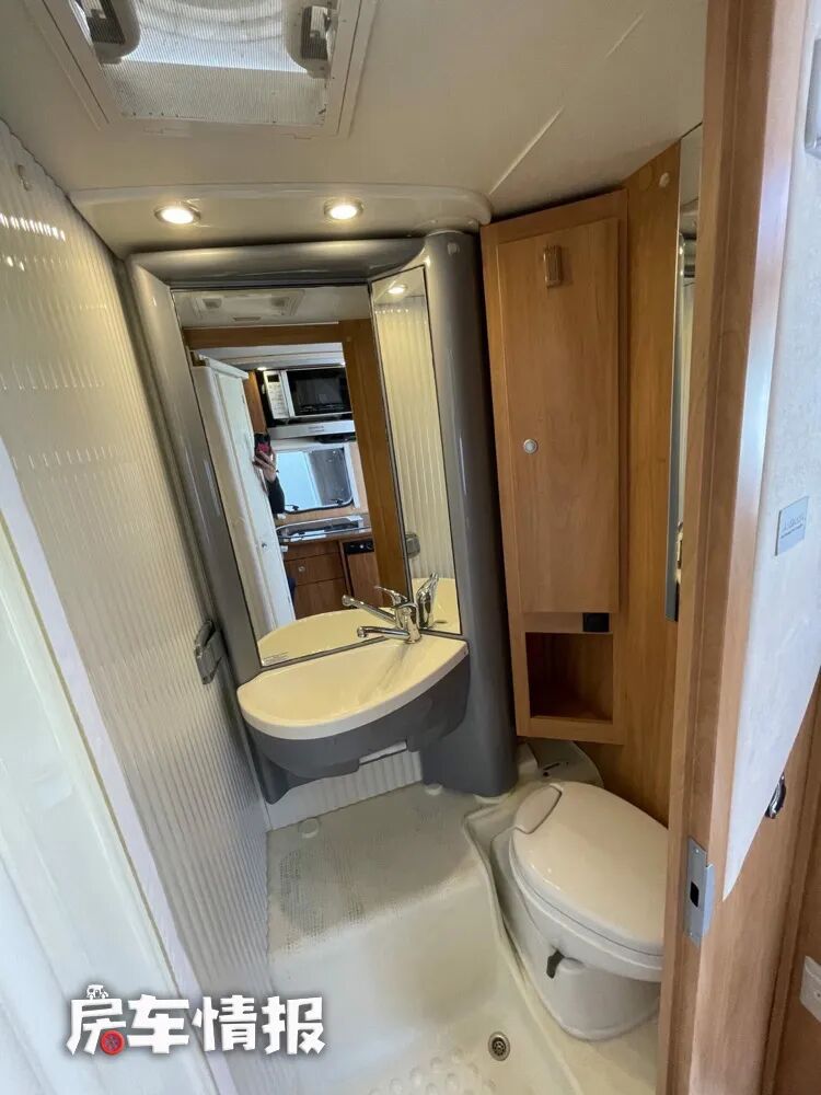 虽然说整辆车的长度不足6米,但是车内的卫浴室空间表现还是不错的,提供了可旋转的盒式马桶、储物柜和盥洗台,日常如厕和简单洗漱的时候就正常的使用,当需要淋浴的时候,则需要将盥洗台旋转到一侧,这样就变成了一个独立的淋浴间,也能实现干湿分离的功能。
