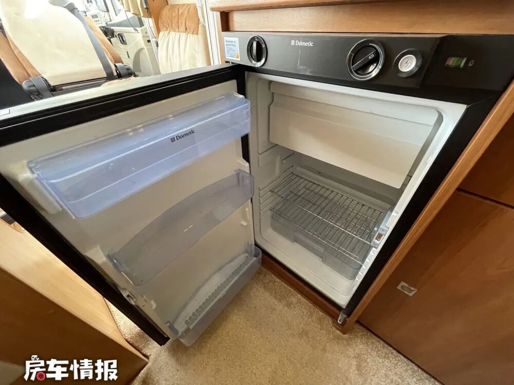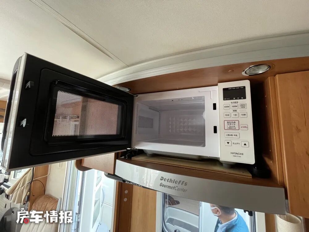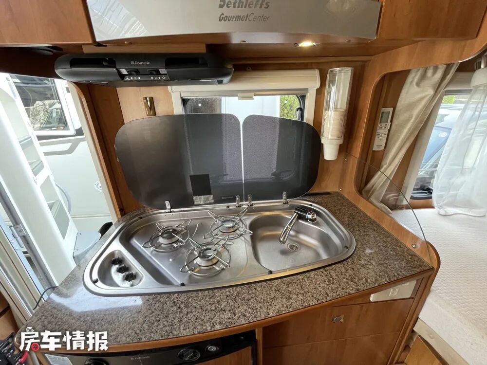 厨房操作台是位于乘客门的后方,台面上带有翻盖的一体式水槽和双孔燃气灶,能够满足日常的烹饪需求,上方还提供了一台抽油烟机和微波炉,下方则嵌入了一台车载冰箱,也能存放一些简单的食物。