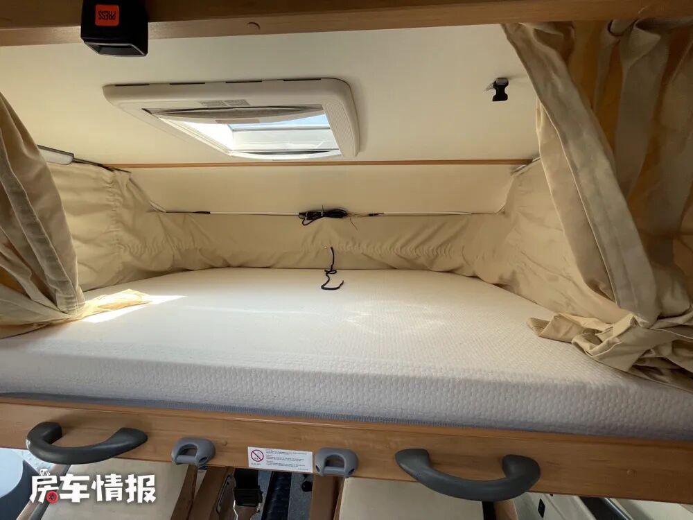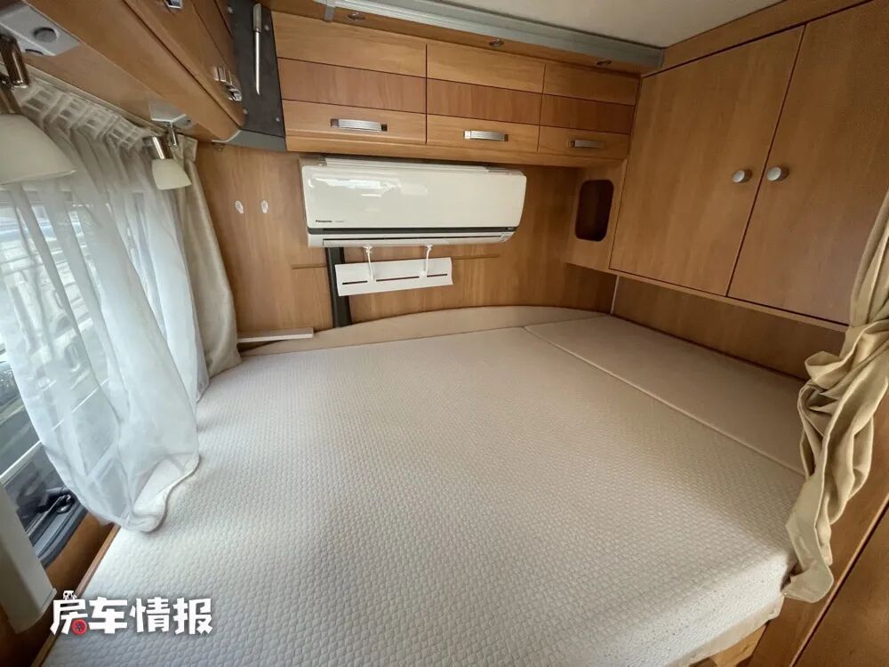 最后就是位于车厢尾部的横置双人床,顶部带有一圈的储物吊柜,后方还安装了一台家用变频空调,可以调节车内的温度,从而达到一个较为舒适的居住环境。