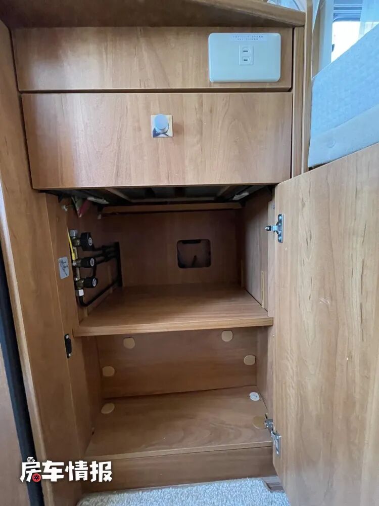 这款车在水电路上是搭载了一台3000W的逆变器,提供净水箱和灰水箱,同时整辆车还带有热水锅炉和FF取暖器,以保证日常可以正常的使用车辆。