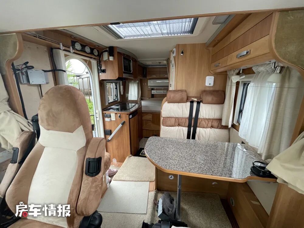 进入车厢内部,从整体的配色上一看就是欧美房车的设计风格,整辆车是一款核载4个人的车型,就餐区是采用了双人连排座椅+餐桌的设计,平时还可以在这里调整小憩,顶部带有大尺寸的天窗,所以为这个区域带来了不错的采光度。