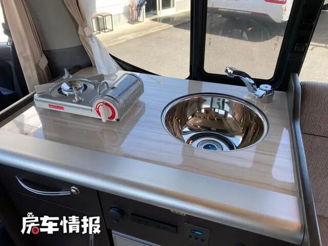 最前方主驾驶座椅后方是一个尺寸不大的厨房操作台,提供了不锈钢的水槽、卡式炉和车载冰箱,也能够满足日常基本的烹饪之需。
