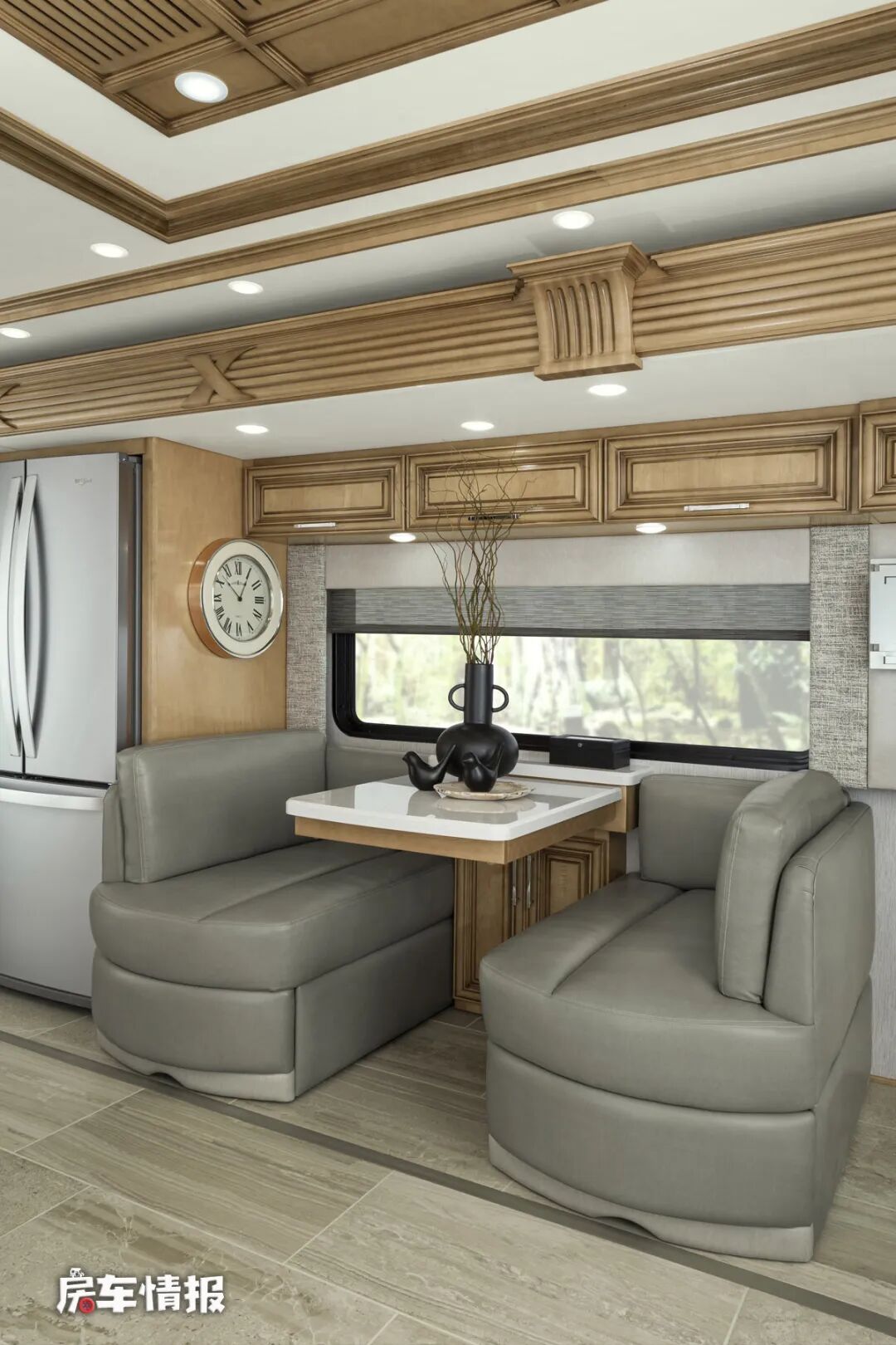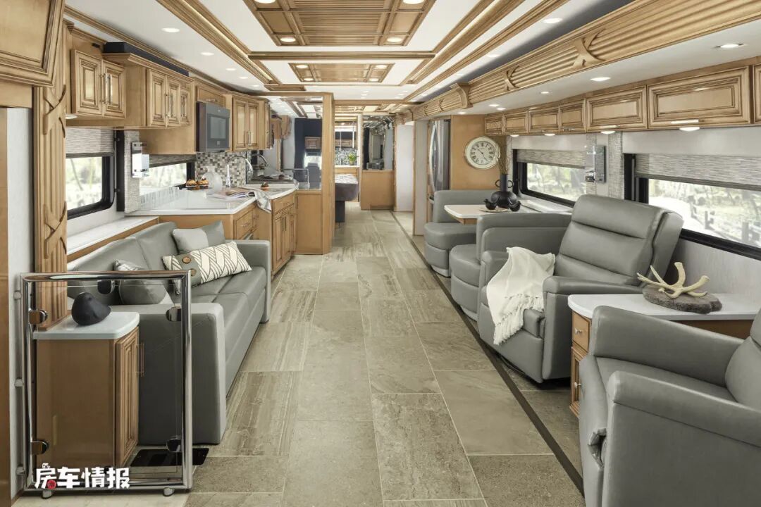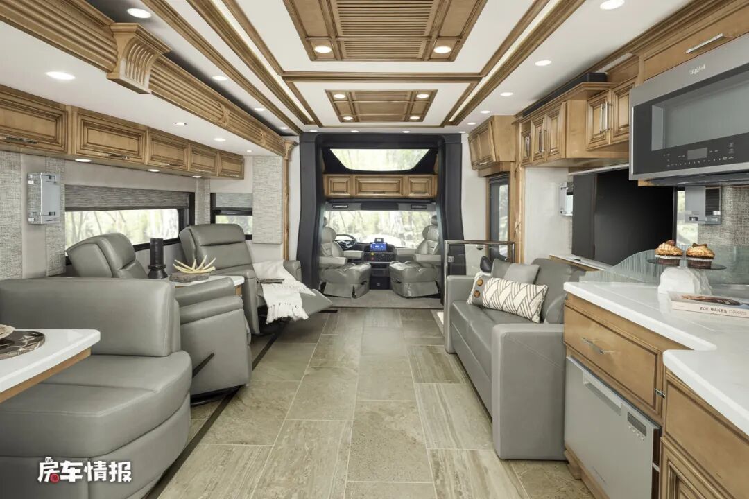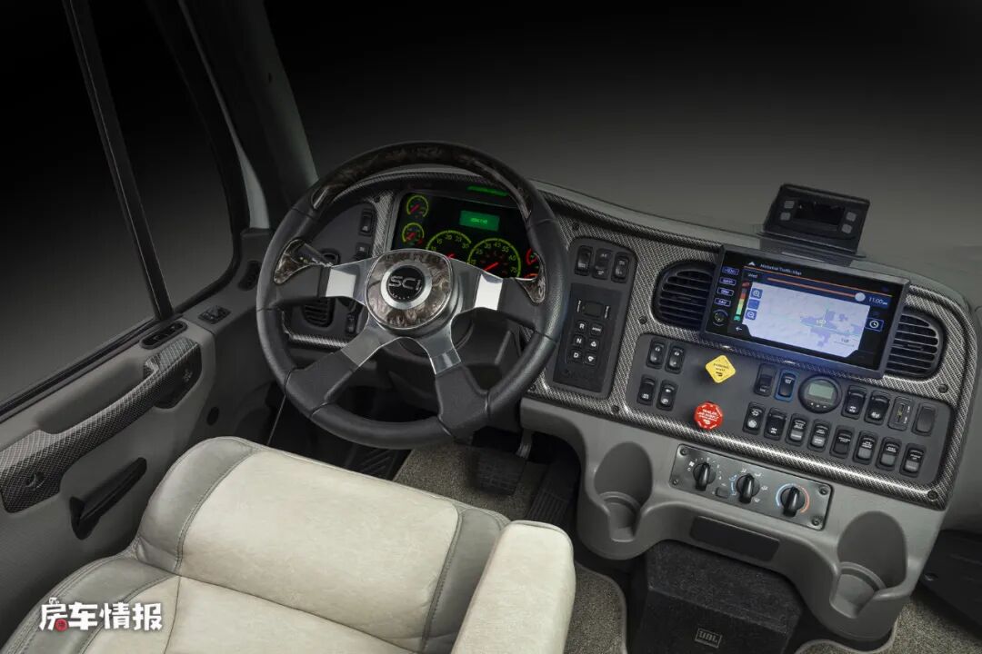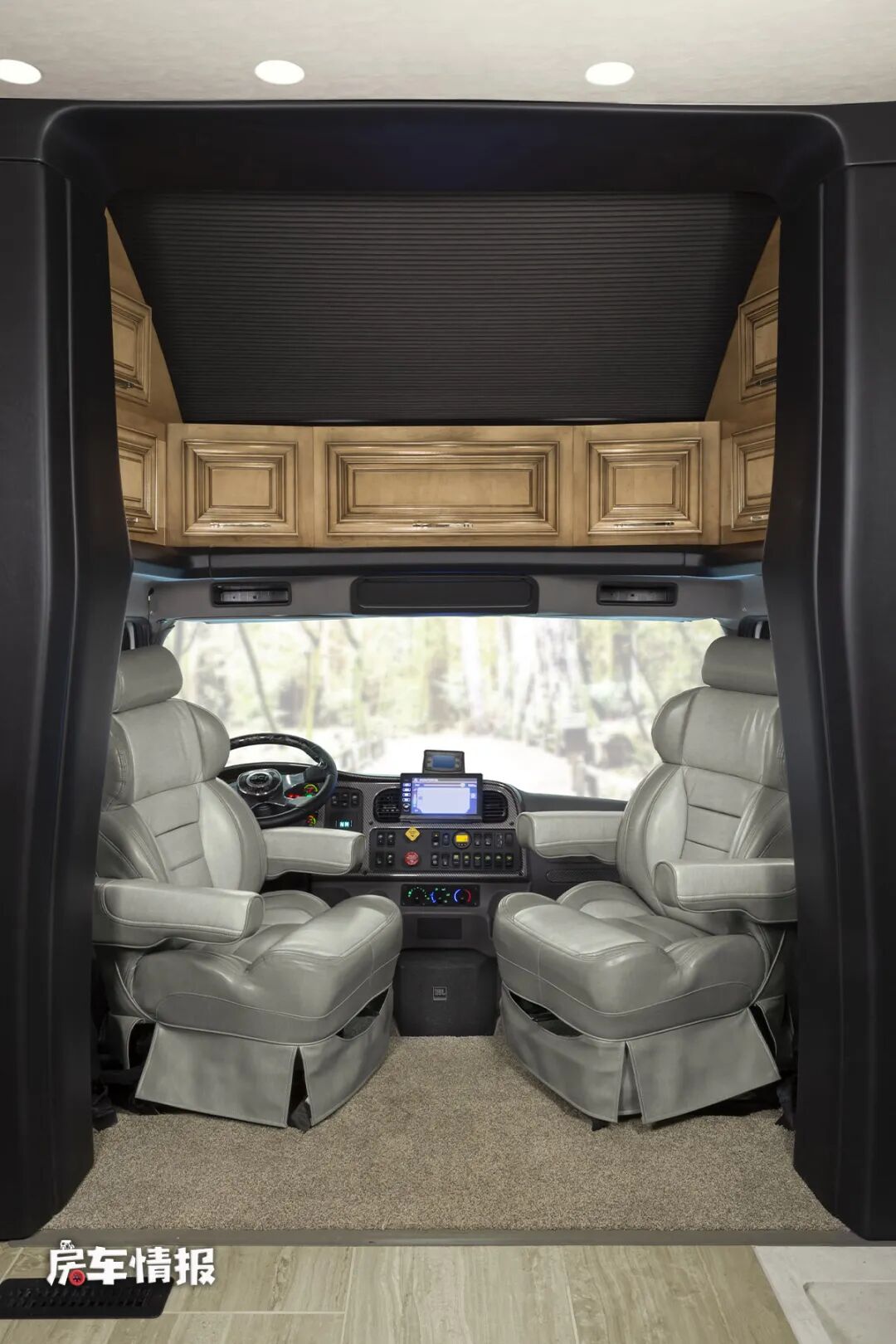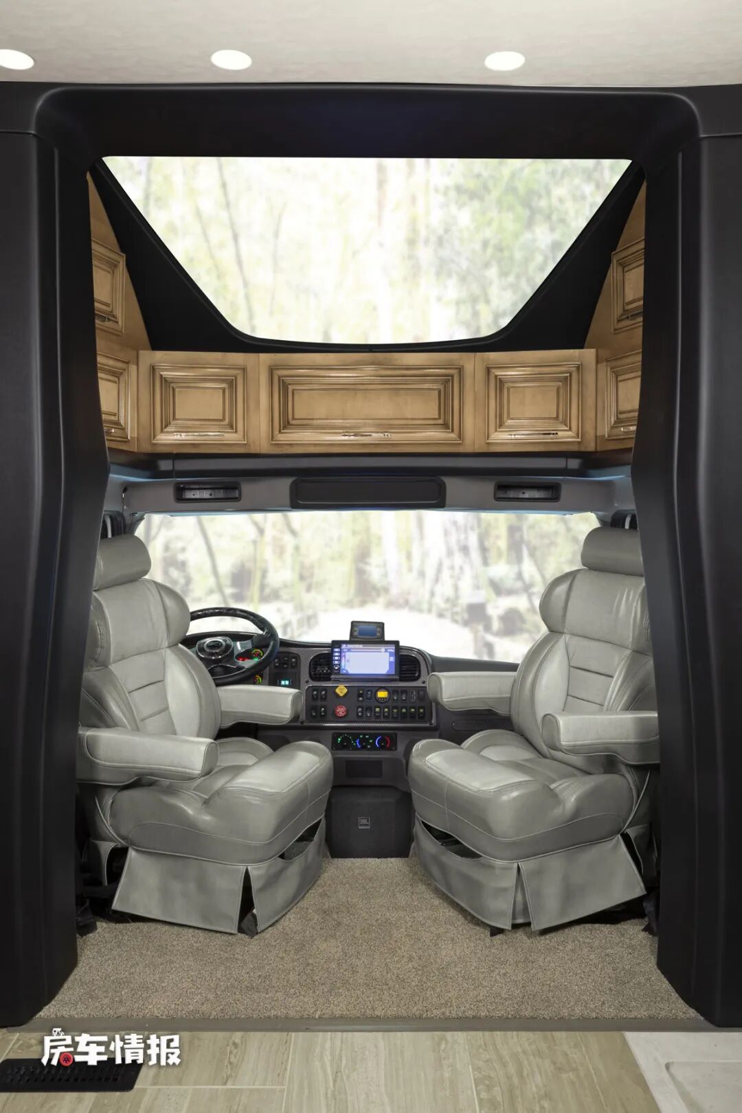 最前方的驾驶室顶部配置了一圈的储物吊柜,顶部还带有超大尺寸的弧形天窗,主副驾驶座椅全部采用真皮包覆工艺,并分别带有可旋转的功能。