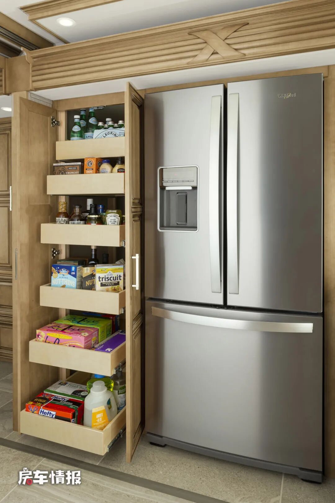 在就餐区后方是一台三开门的超大容积冰箱,旁边还设计了一个多层抽拉的零食收纳架。