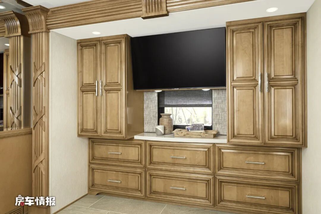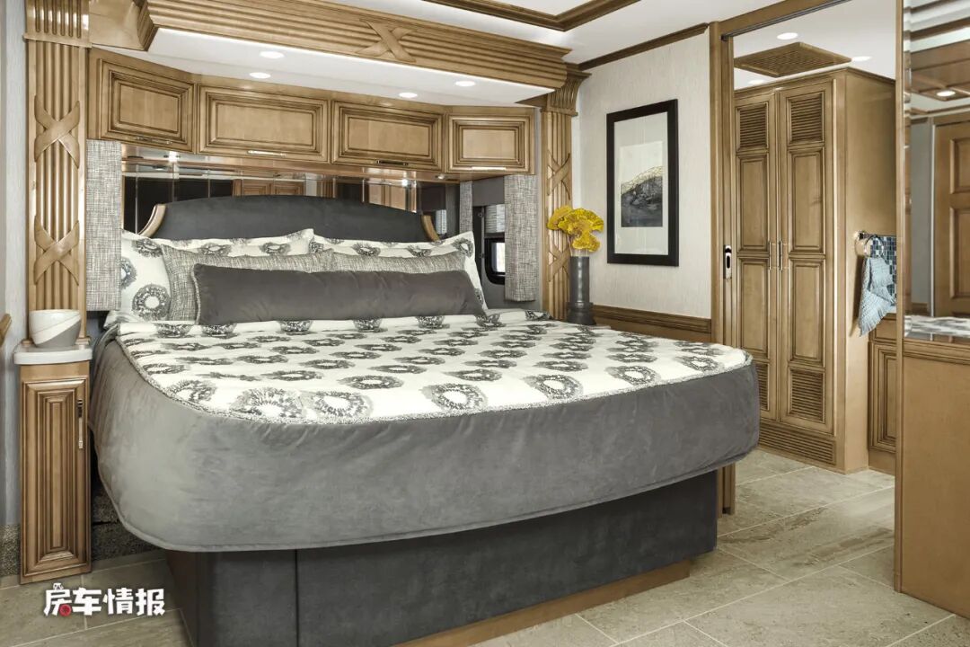 最后方就是整辆车的休息区了,一侧是位于侧拓展舱内的超大双人床,另一侧也是位于拓展舱内的电视柜,还配置了一台50英寸的三星4K LED电视。