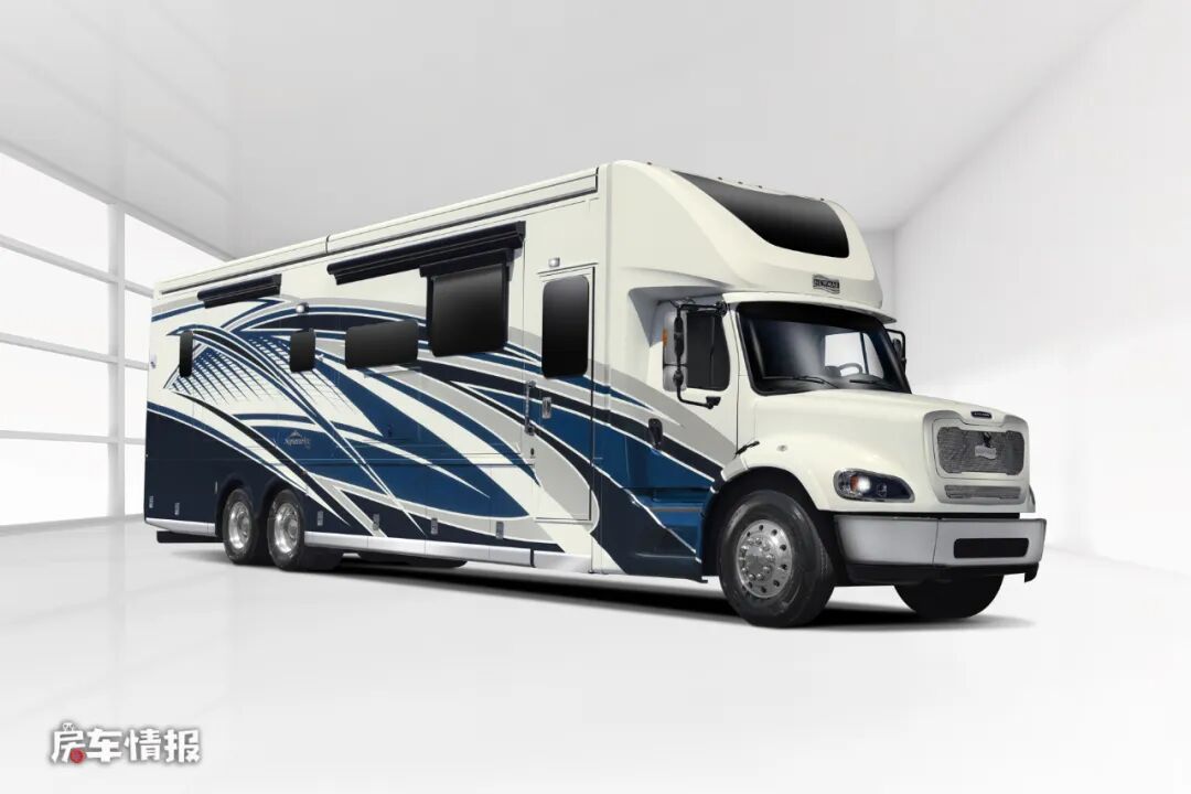 说回这辆车——Supreme Aire,这是一款基于Freightliner(福莱纳)M-2 112底盘所打造的超级重卡房车,从凸出的“大鼻子”可以很直观的区分,车身外观上也配有Newmar一贯使用的彩绘设计,后期还可以选择其他自己喜欢的颜色。