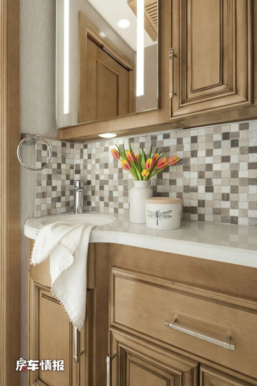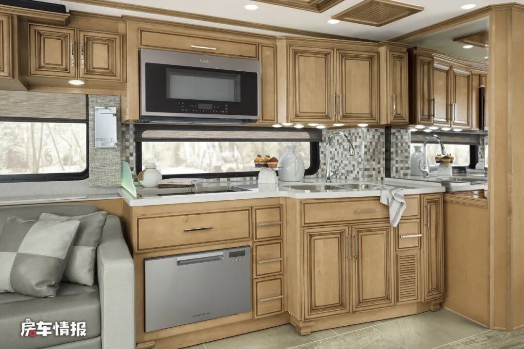 与就餐区相对的是整辆车的厨房区域,操作台的尺寸和配置足以媲美豪华的别墅设计,台面上带有双孔的燃气灶、双盆的不锈钢水槽、微波炉、洗碗机等,在这里做饭也是一种享受。