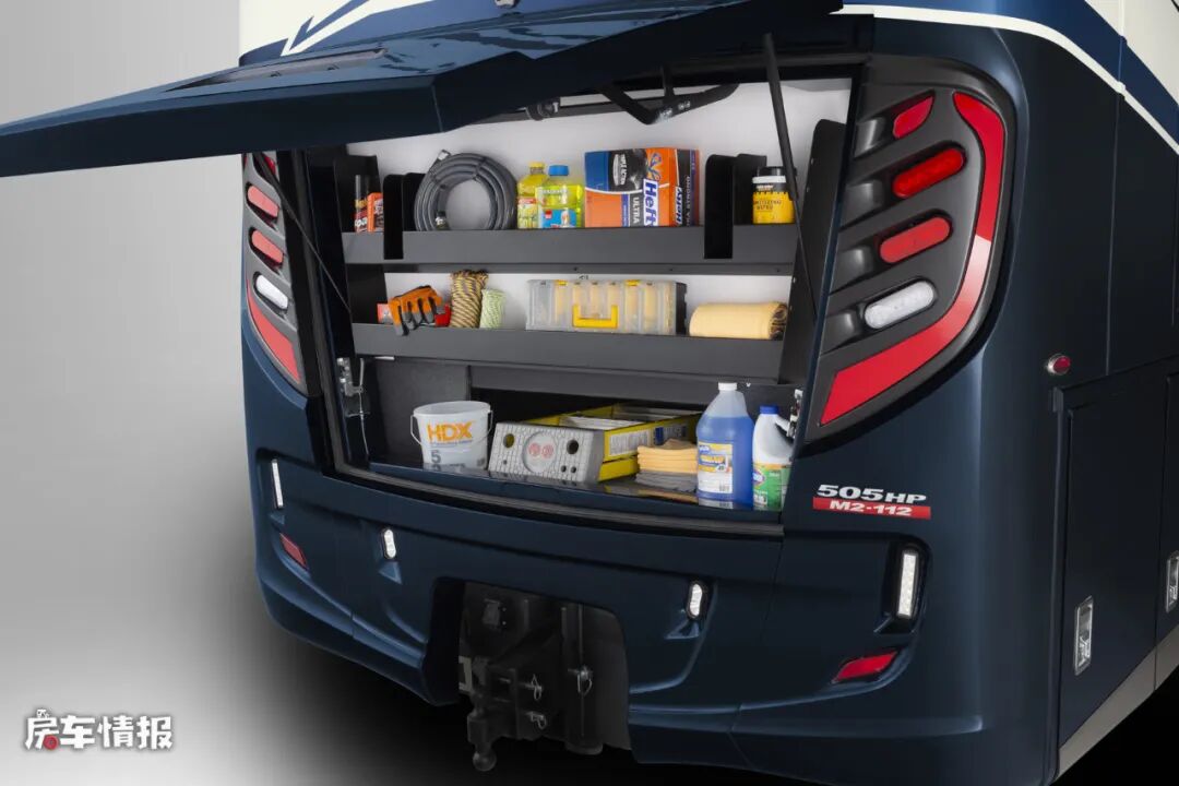车辆左右两侧都分别带有2个拓展舱,全车共四个,而由于车身较高,裙摆下方则被设计成了多个外置的储物柜,车尾部还设计了一个立体扁平式的工具箱,另外下方还提供了一个 30000磅的牵引挂钩。